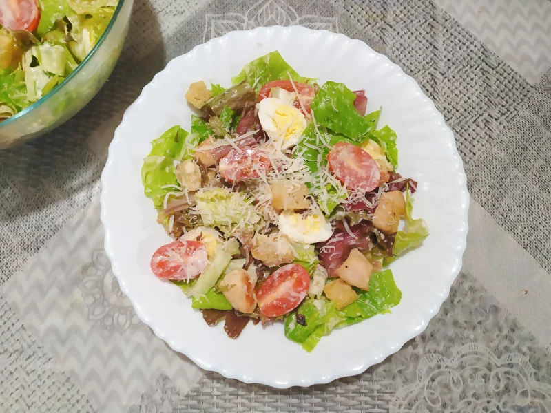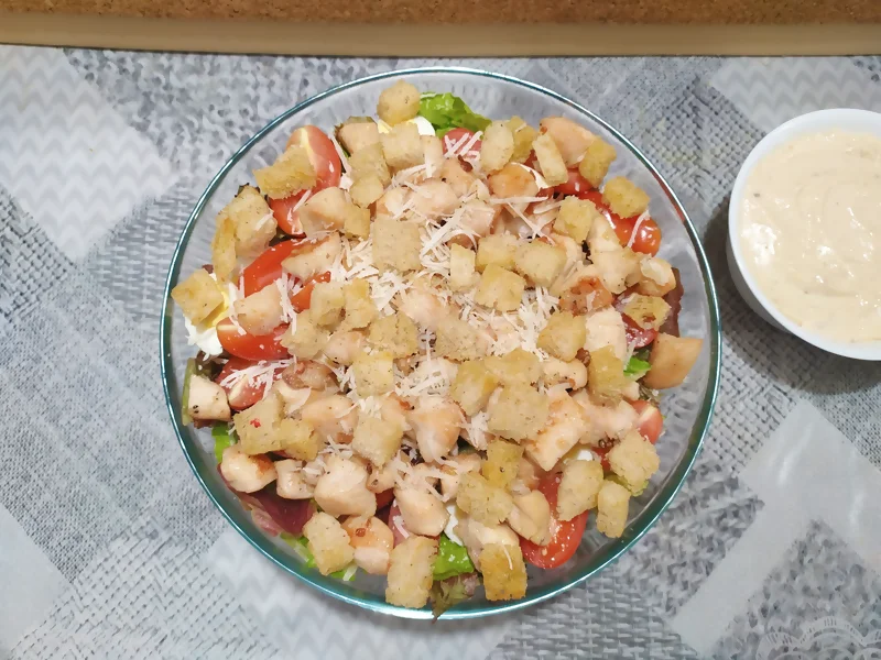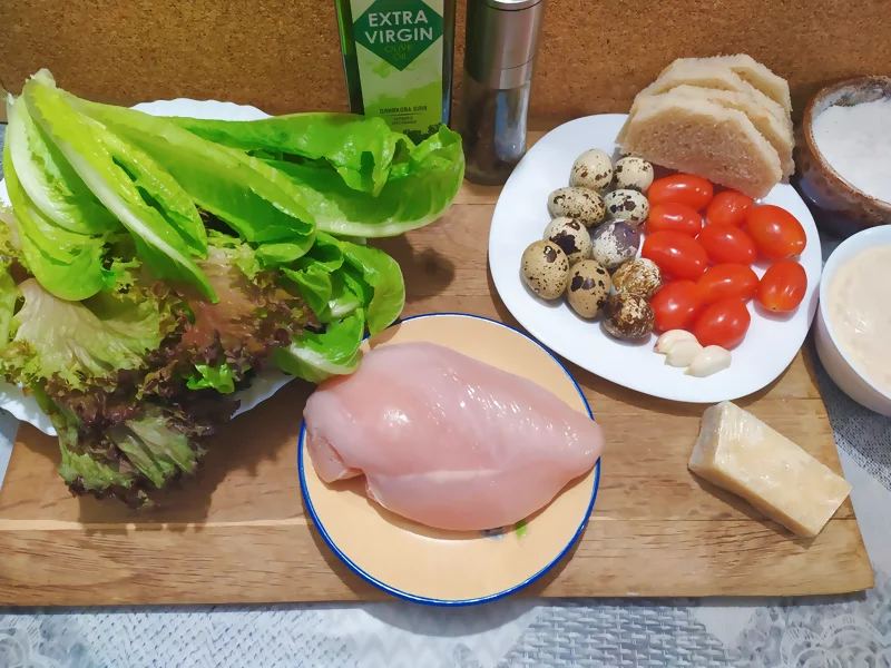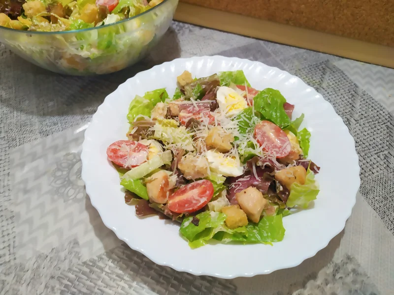 До речі, салат для цезаря можна взяти на власний смак. Найчастіше цезар готують із салату ромен чи айсберг, але можна також взяти і салатний мікс. -
