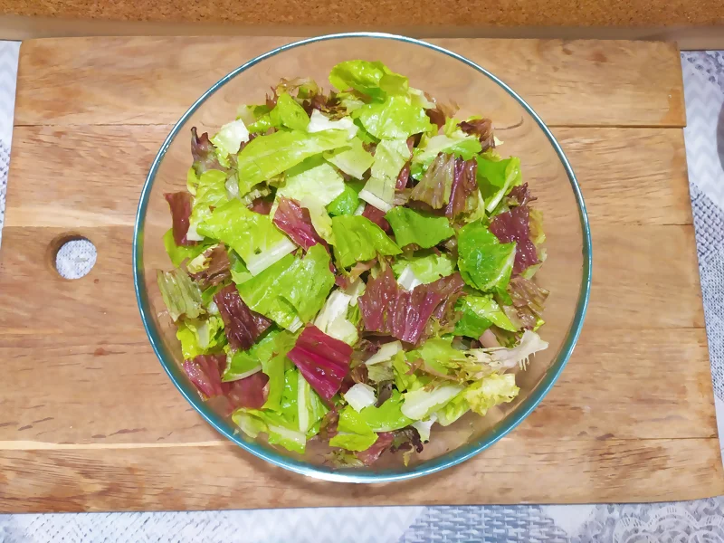 Викладаємо у салатник або миску 300 г подрібненого салатного листя. Це може бути мікс салату, або Ромен чи Айсберг.