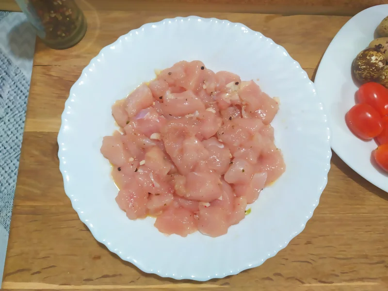 Нарізаємо філе курки кубиками (близько 1,5 см), поливаємо парою ложок оливкової олії, солимо і перчимо за смаком. Рубаємо зубок часнику і додаємо до курки, добре перемішуємо та залишаємо маринуватися.