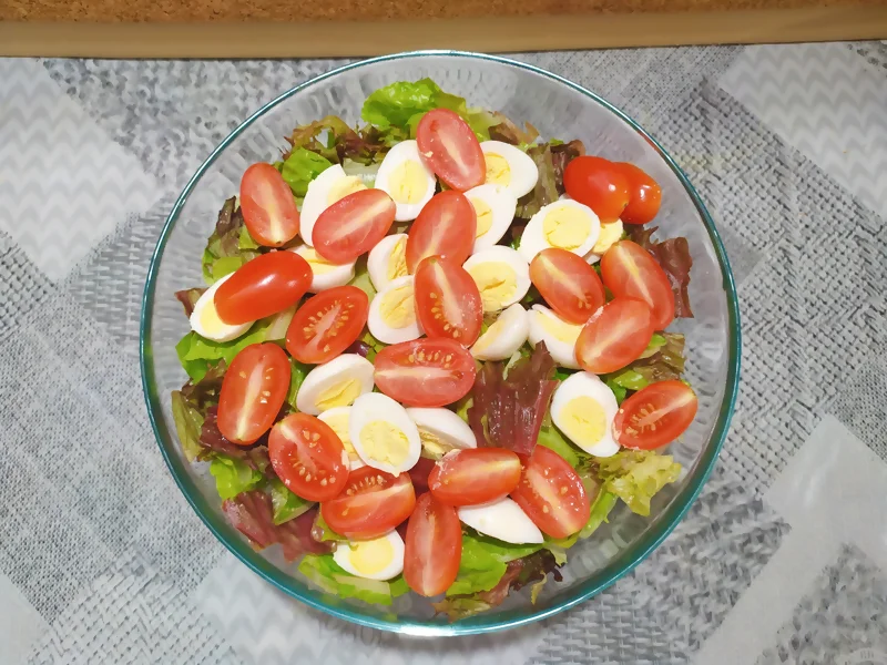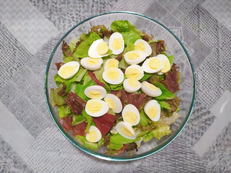 Розморожуємо та промиваємо 1 куряче філе. Перепелині яйця варимо 2-3 хвилини після закипання, щоб отримати ніжний жовток. Також промиваємо листя салату, залишаємо його, щоб просохло.