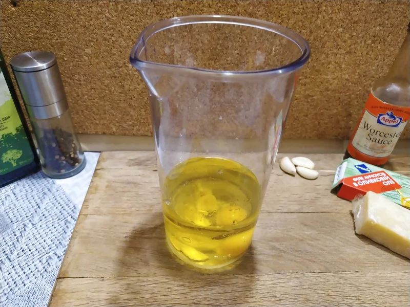 Для заправки салату можна взяти готовий соус або зробити його самостійно. Щоб приготувати заправку для цезаря, наливаємо в чашу блендера 200 мл соняшникової рафінованої олії, за бажанням додаємо ще ложку оливкової (для запаху). Акуратно розбиваємо 1 яйце, щоб жовток залишався цілим, додаємо сюди ж 1 ч. ложку гірчиці, 1/2 ч. ложки цукру, 3 ч. ложки лимонного соку, 1/4 ч. ложки солі та 1 ст. ложку вустерширського соусу.
