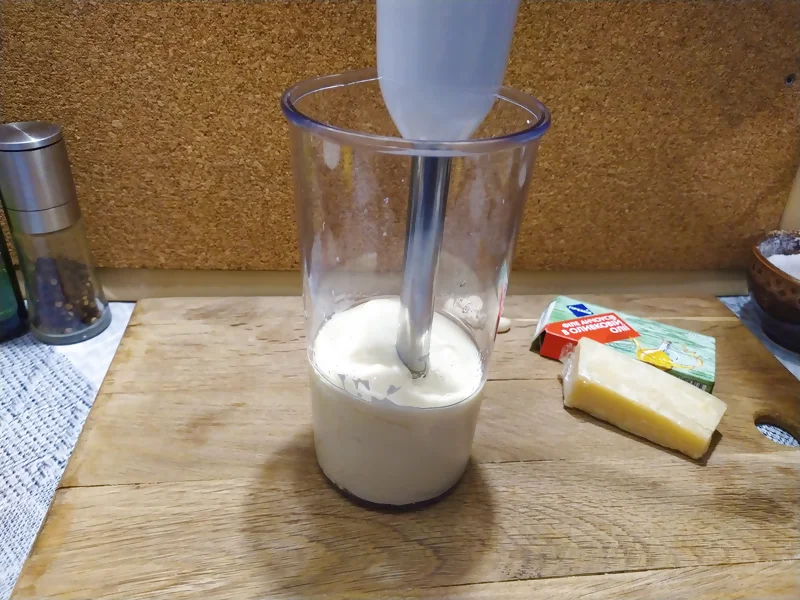 Занурюємо блендер до самого дна чаші, щоб він покрив жовток, починаємо збивати. Емульгуємо (змішуємо) соус доти, доки він не побіліє і не загусне.