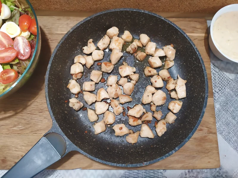 Викладаємо до салату Цезар обсмажену курку. Якщо готуєте салат для святкового столу, краще дати філе трохи охолонути, інакше салат швидше промокне. Для себе можна додавати тепле філе безпосередньо перед подачею салату.