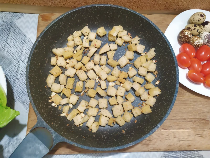 З білого хліба видаляємо скоринку та нарізаємо м'якіш кубиками (близько 1 см). На сковороду наливаємо пару ложок оливкової олії, розігріваємо до середньої температури та викладаємо хліб, додаємо зубок рубаного часнику та підсмажуємо сухарики.