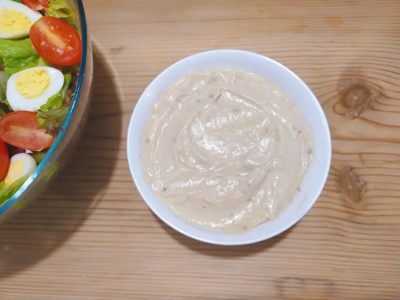 І ще зверніть увагу, що з 1 яйця виходить близько 280 г соусу, тобто не на один салат. Тим не менш, цей соус дуже смачний і підходить для заправки інших салатів або приготування бутербродів. -