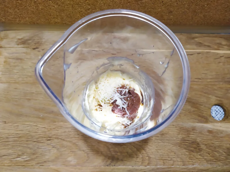 Додаємо в чашу 2-3 невеликі філе анчоусів, нарізаних ножем, часник пропускаємо через прес, а пармезан натираємо на тертці. Збиваємо соус секунд 5, щоб усі компоненти рівномірно розподілилися.