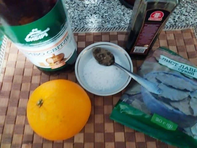 Для приготування маринаду нам знадобиться пиво (світле), один великий апельсин, соєвий соус, вода (холодна), сіль та спеції.
