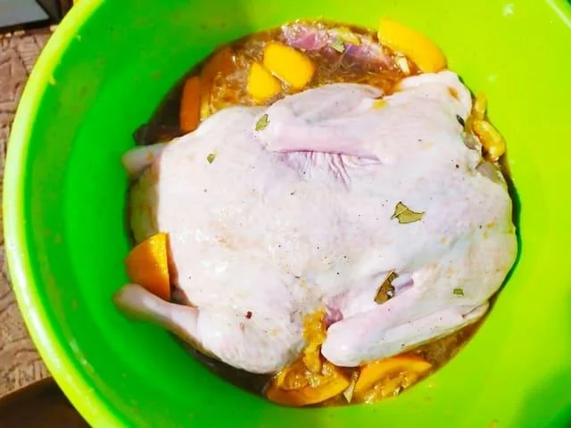 Коли маринуємо качку, укладаємо її грудкою вниз, а при запіканні вгору. У процесі запікання спинка довше перебуватиме в соці, тому добре промаринувати грудку нам важливіше. Якщо можна, краще кілька разів перевернути тушку під час маринування, щоб вона промаринувалася рівномірно.