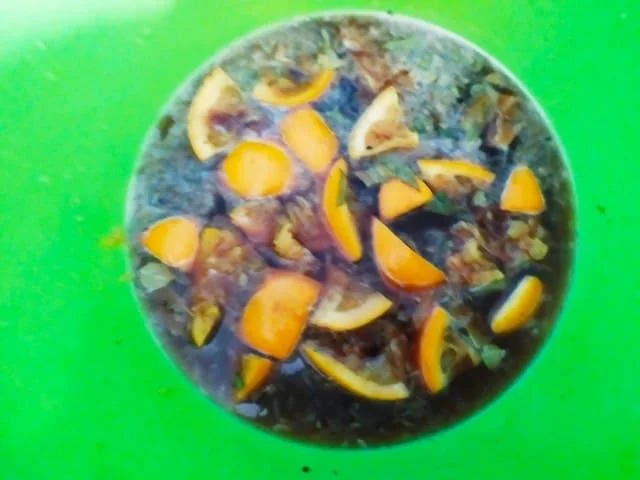 Беремо велику миску (щоб помістилася тушка) та з'єднуємо в ній пиво, воду, соєвий соус та сіль. Апельсин ріжемо шматочками, трохи зминаємо, щоб пустив сік, і відправляємо у маринад. Сюди ж додаємо перець горошком (можна замінити меленим) та лавровий лист.
